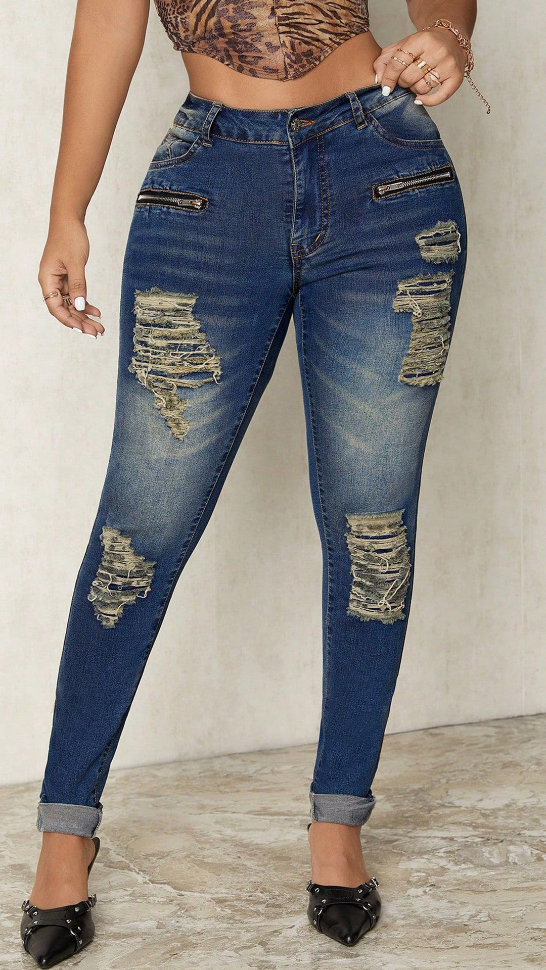 Detta är ett trendigt och mångsidigt par jeans som utstrålar edgy stil och casual chic. De slitna detaljerna ger jeansen en känsla av robust charm, vilket skapar en cool och avslappnad look som är perfekt för att lägga till en touch av attityd till din outfit. Perfekt för en ledig dag ute.