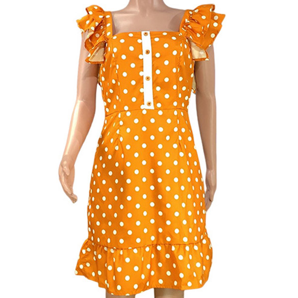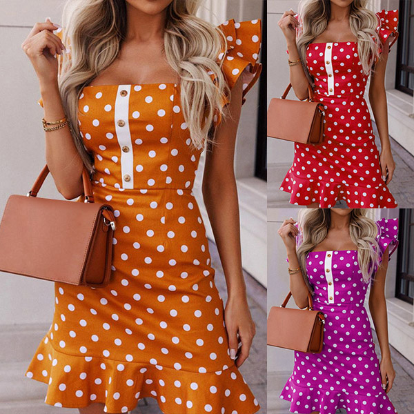 Pricktryckt mode miniklänning med fyrkantig hals, volang nederdel och capsärm
