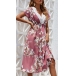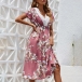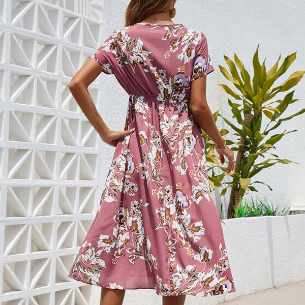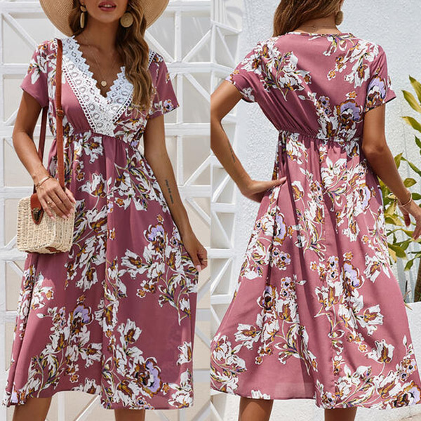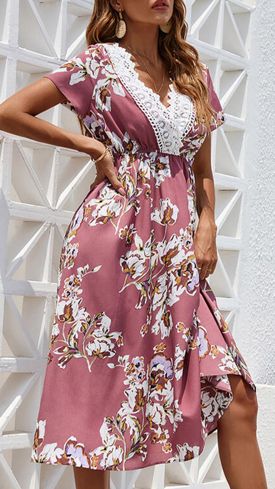 Modeklänning med övergripande blommigt tryck, sexig spetsskarvad V-ringning, kort ärm, hög midja och midilängd.