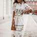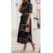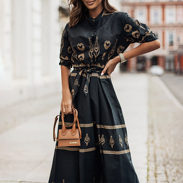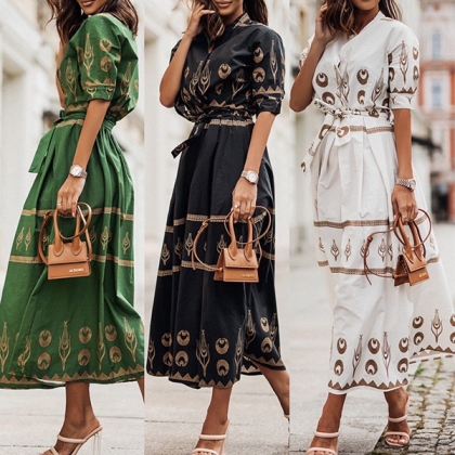 Fashion Floral Printed Mock Neck Elbow Sleeve Self-tie Dress