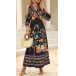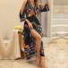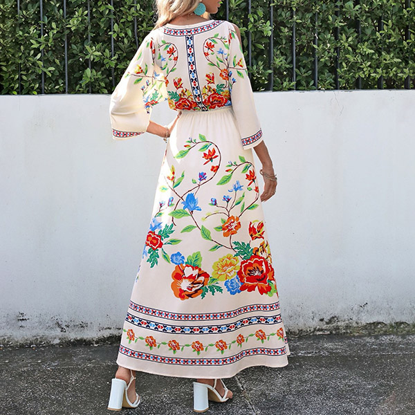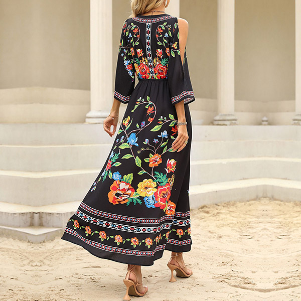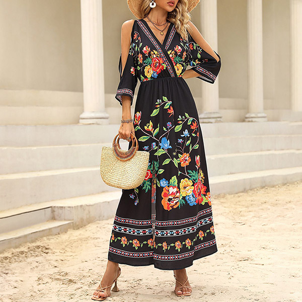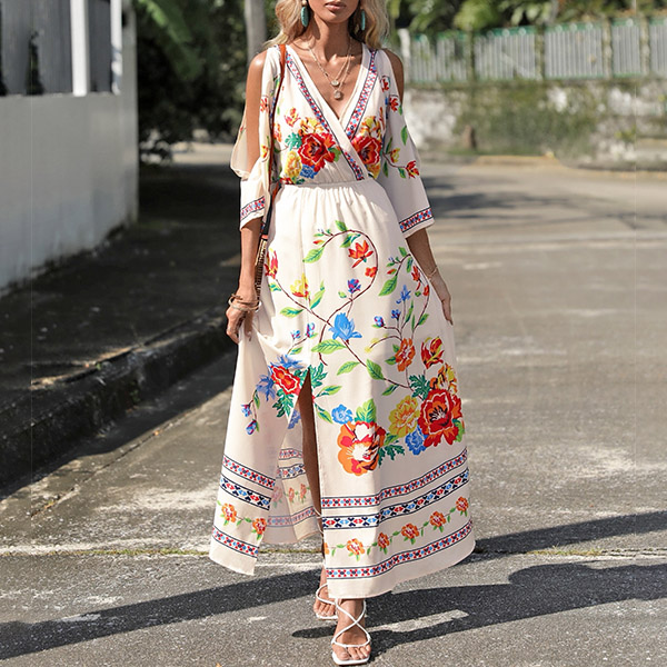 Fashion Floral Printed V-neck Open Shoulder Elbow Sleeve Slit Midi Dress