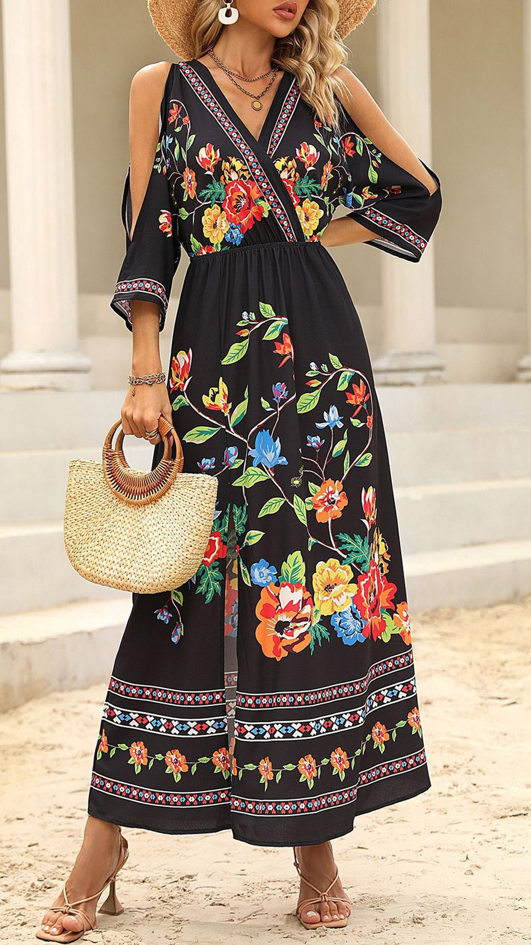 How about this midi dress? The floral print adds a touch of romance and femininity, while the V-neckline and open-shoulder design make it perfect for dressing up or down. Wanna have a try?