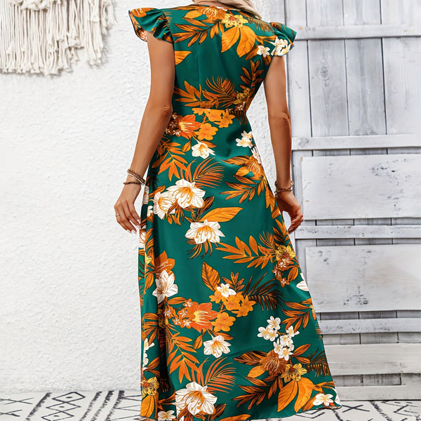 Detta är en chic och feminin klänning som utstrålar elegans och charm. Blommönstret lägger till en touch av romantik och nyckfullhet, och skapar en livfull och iögonfallande design perfekt för att omfamna naturens skönhet. Den hög-låga fållen ger en modern och trendig twist, vilket skapar en dynamisk och stilig look som garanterat drar uppmärksamhet. Perfekt för sommarens garderob.