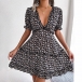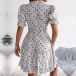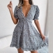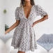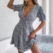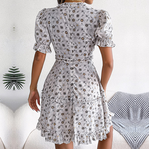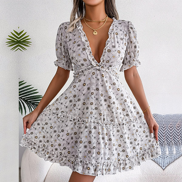 Miniklänning med övergripande blommigt tryck, kort ärm, djup V-ringning, kjol med våningar och volang design längs fållen, är det din stil?