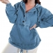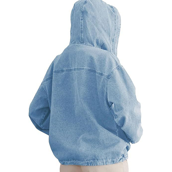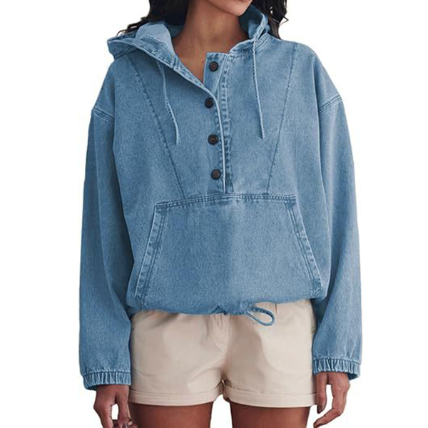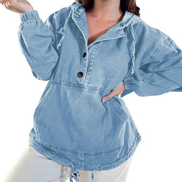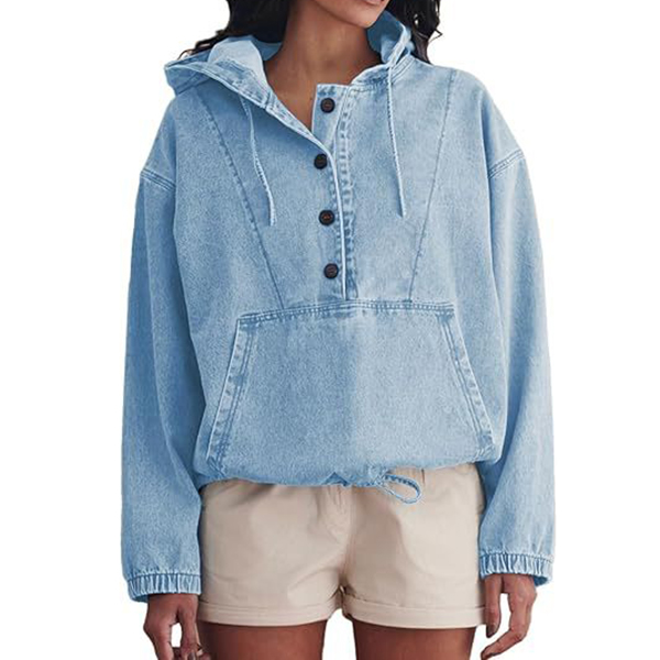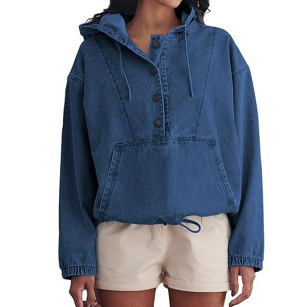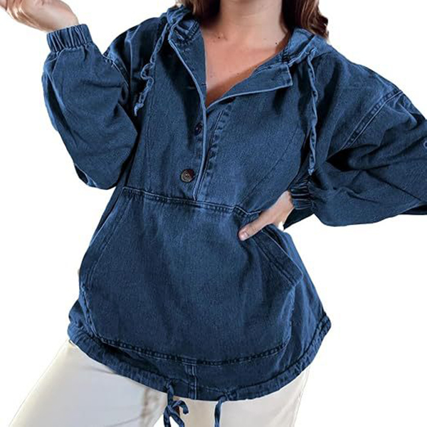 Denimjacka, långärmad med huva, framknäppt dragsko och kängurufickor
