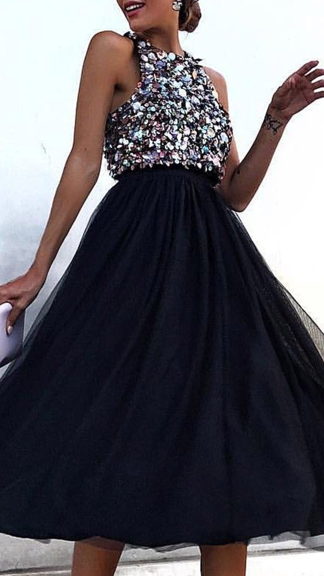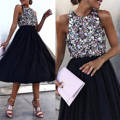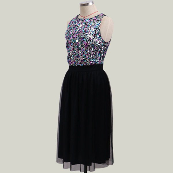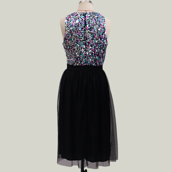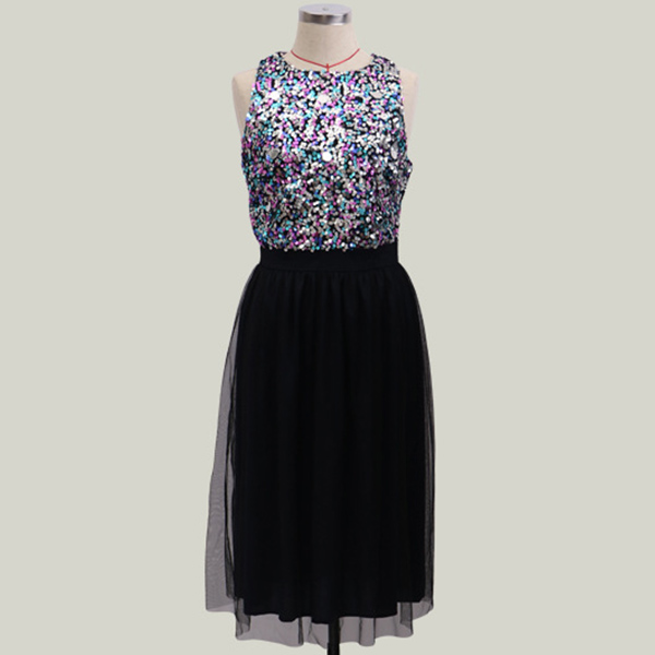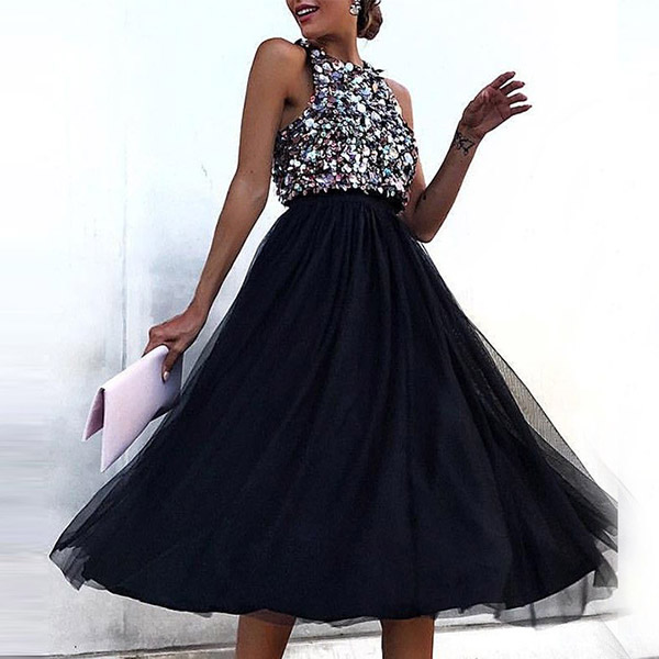 För kvällens middagsdejt kan du lita på att denna klänning hjälper dig att fånga fler blickar. Med ärmlös design, rund hals och hög midja, blir den skarvade fållen och paljettdetaljerna en strålande och attraktiv helhet. Matcha helt enkelt med dina sexiga klackar för en fantastisk look!