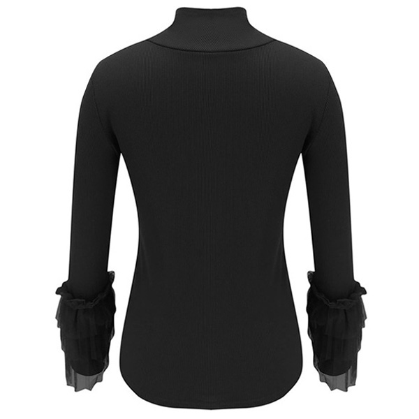 Fashion Gauze Spliced Long Sleeve Mock Neck Slim Fit Top