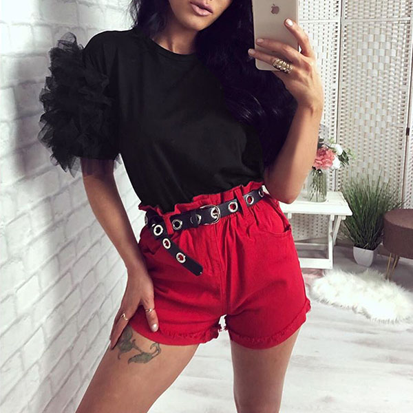 Compared with your other t-shirts,this piece not only can ensure you the comfy,but also can bring you more style,so why not take interest in it? What makes this piece look so attractive is because of the gauze spliced details at the sleeve part. Perfect fit for matching with different style bottoms.