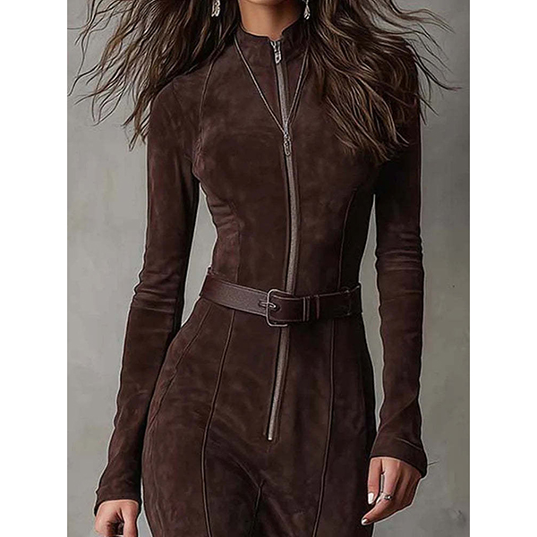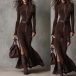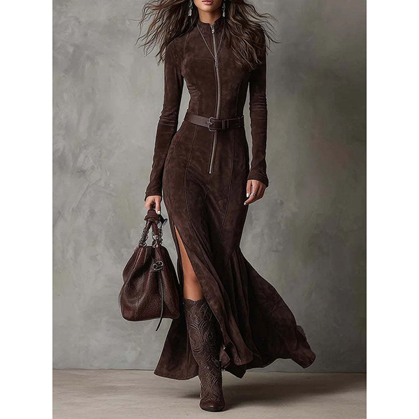 Maxiklänning i lyxigt mockatyg med unik kombination av mjuk taktilitet och modern elegans. Den höga halsringningen och den diskreta, funktionella dragkedjan skiljer den från vanliga maxiklänningar och ger en slimmad, sofistikerad silhuett. Styla upp eller ner med det djärvt placerade sidosprundet som skapar en dramatisk, följsam rörelse i varje steg. Perfekt för kvällsevenemang, höstinspirerade tillställningar eller exklusiva mingel – detta plagg levererar premiumkvalitet, tidlös design och oemotståndlig charm. KeywordS: maxiklänning, mockatyg, halsringning, dragkedja, sidosprund, kvällslook, höstmode, elegant textur.