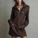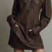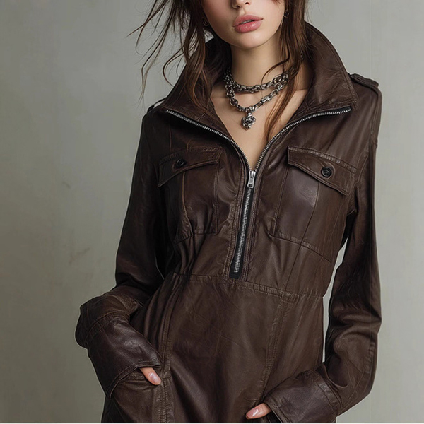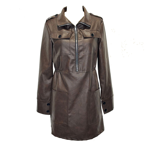 Klänning i konstläder PU – V-ringad med halv dragkedja, epåletter och långärmad med påsydda fickor