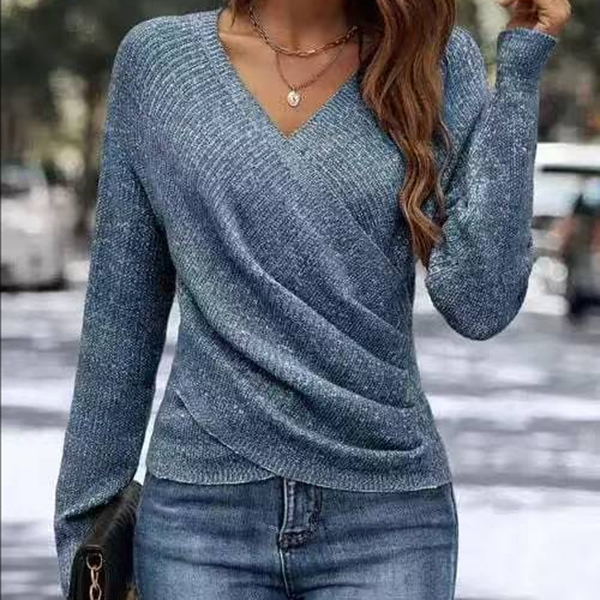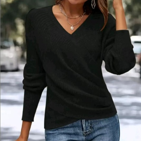 Denna avslappnade skjorta har en unik korsad V-ringning, en dynamisk, oregelbunden fåll och en bekväm stickad konstruktion för modern, avslappnad elegans. Kombinera med åtsittande byxor och vardagsskor för en snygg, avslappnad och modern look.