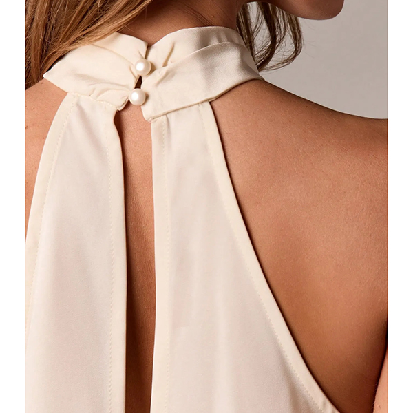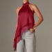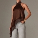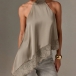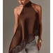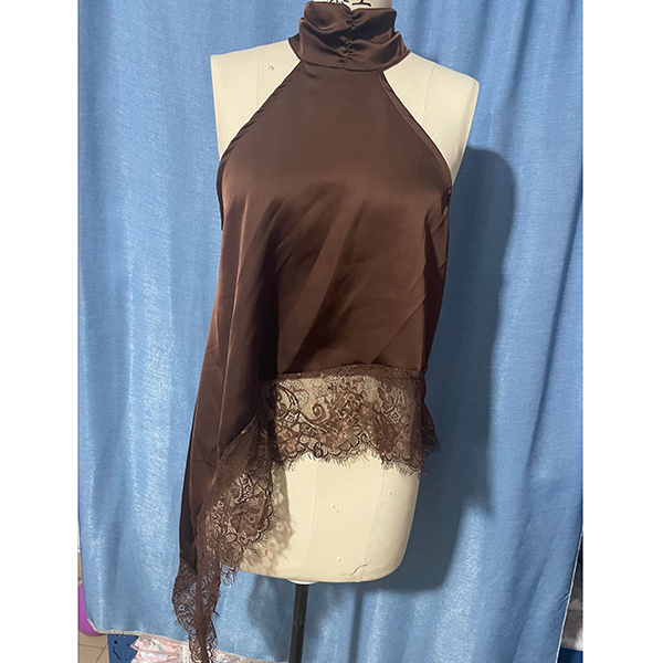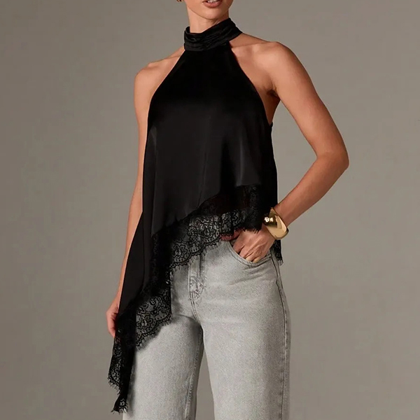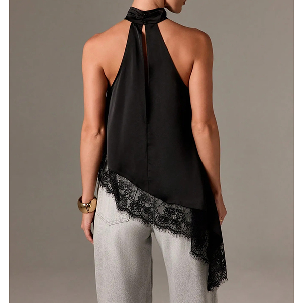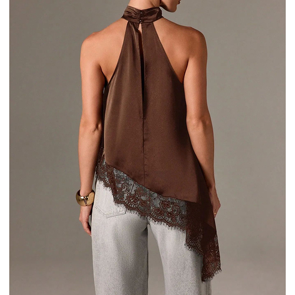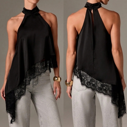 Denna skjorta har en modern, moderiktig stil med en elegant halterneck-konstruktion och delikat spetsskarvning som ger feminin sofistikering. Den oregelbundna fållen skapar konstnärlig rörelse och en dynamisk kant, medan skjortans konstruktion erbjuder mångsidig komfort och säsongsbetonad stil. Perfekt för vardagsbruk.