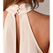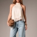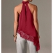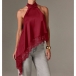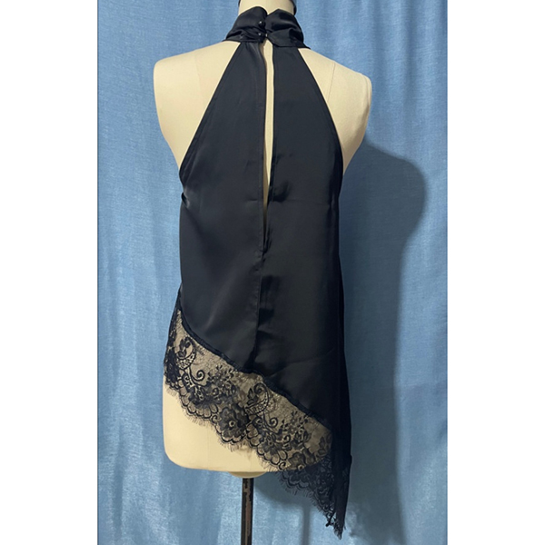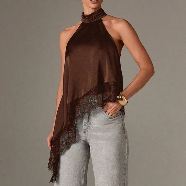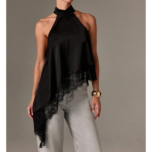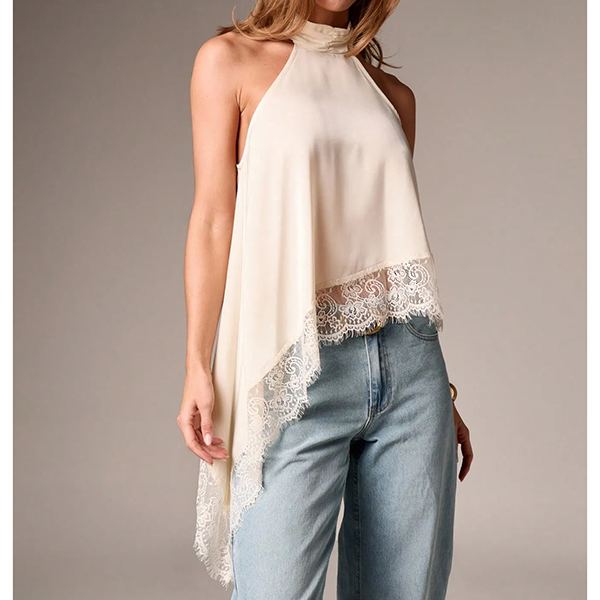 Damhalternecktopp i trendig stil med spets, skarvade detaljer och asymmetrisk fåll