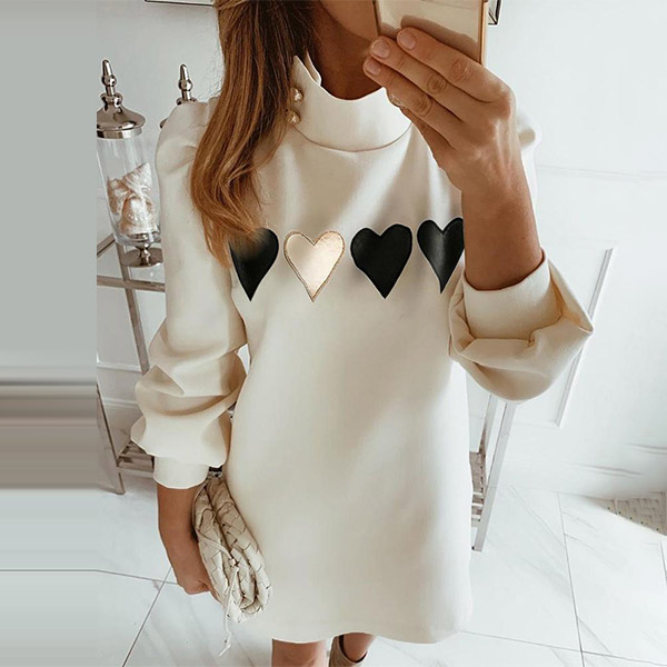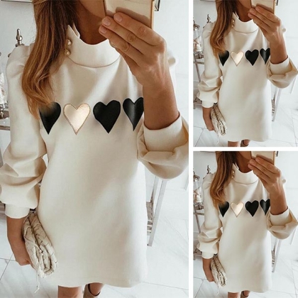 Fashion Heart Printed Long Sleeve Mock Neck Sweatshirt Dress