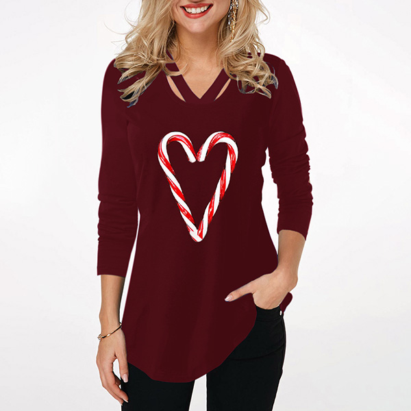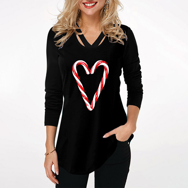 Fashion Heart Printed Long Sleeve V-neck T-shirt