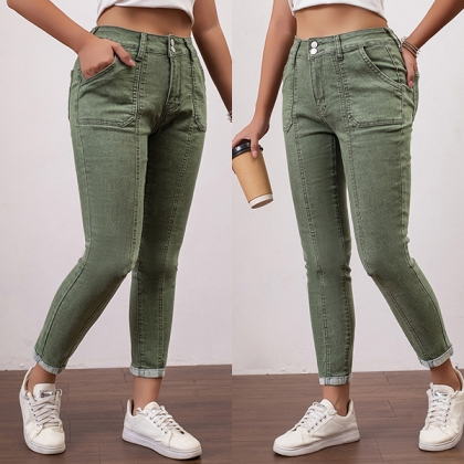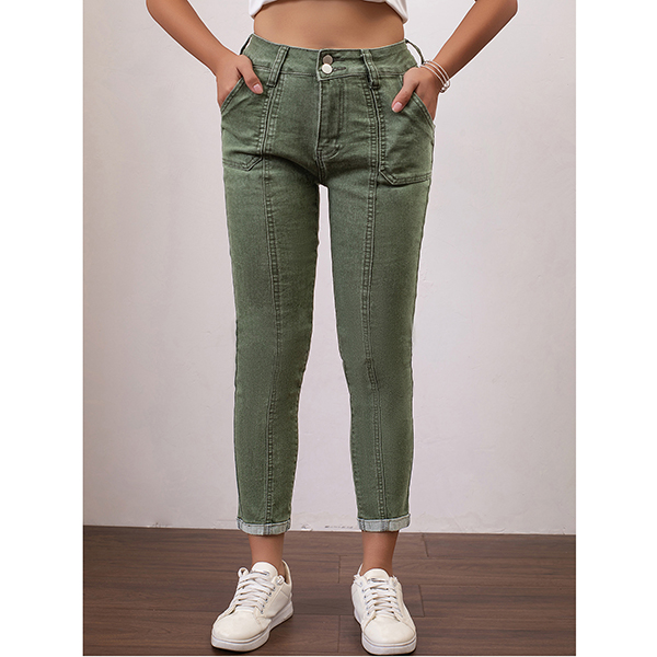 Dessa trendiga gröna jeans i stretchigt premium-denim har en smickrande hög midja som framhäver silhuetten och ger optimal komfort. Funktionella påsydda fickor erbjuder praktisk förvaring utan att bryta den slimmade, moderna passformen. Den unika olivgröna färgen sticker ut i mängden och gör dem perfekta både för vardagsbruk och helgens festligheter. Med slitstark konstruktion och noggrant utvalda material behåller de formen tvätt efter tvätt, vilket gör dem till ett oumbärligt basplagg i varje garderob.