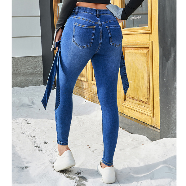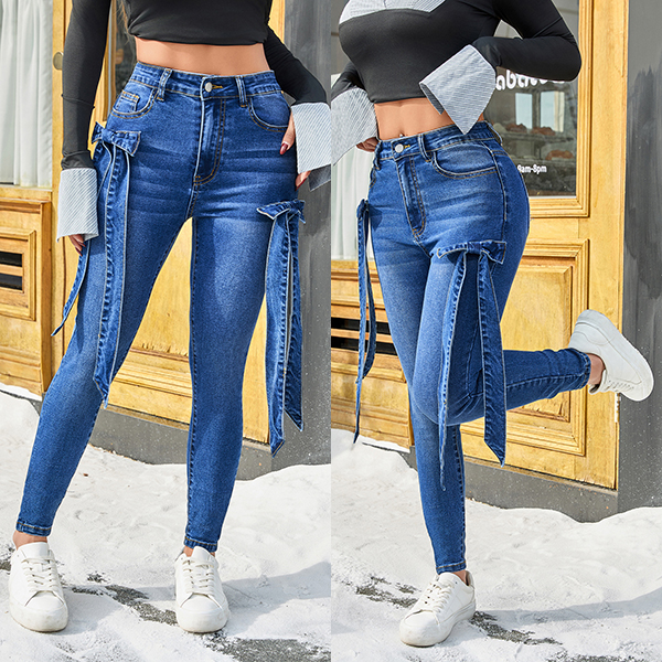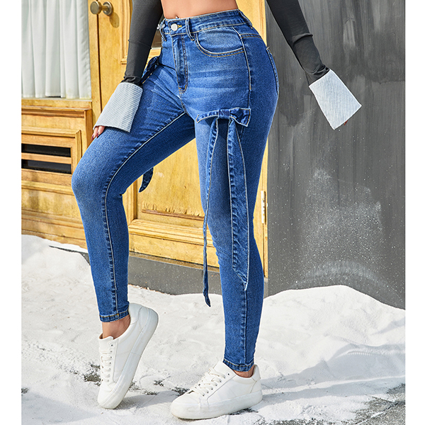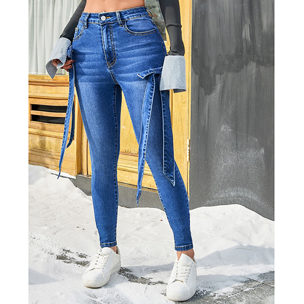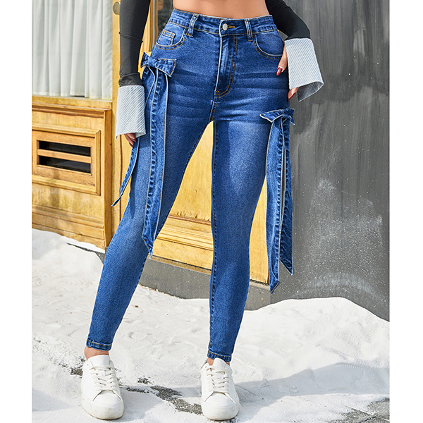 Trendiga skinny jeans med hög midja, rosett och sidosöm i vintage-tvätt