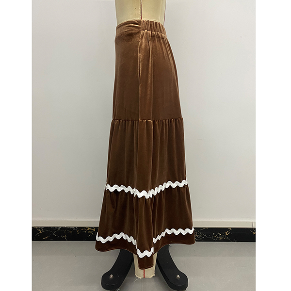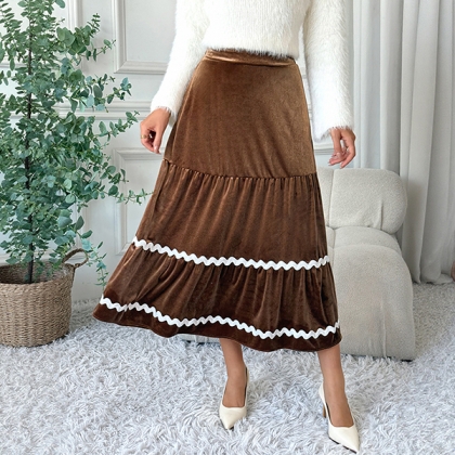 Denna exklusiva sammetskjol med hög midja lyfter fram dina former och ger en tidlös, vintageinspirerad silhuett som skiljer sig från vanliga kjolar. Det unika vågmönstret och den skiktade designen skapar en dynamisk, böljande rörelse vid varje steg, samtidigt som det mjuka sammetstyget fångar ljuset och framhäver kjolens djupa, lysterfulla yta. Perfekt för både fest och vardag – kombinera med enkla basplagg för en sofistikerad look eller med spetsblus för en extra glamorös touch. Upptäck en ny nivå av komfort, kvalitet och feminin finess som gör varje tillfälle oförglömligt.