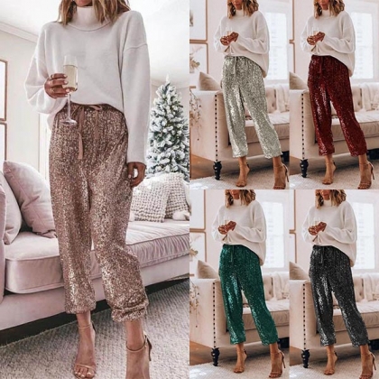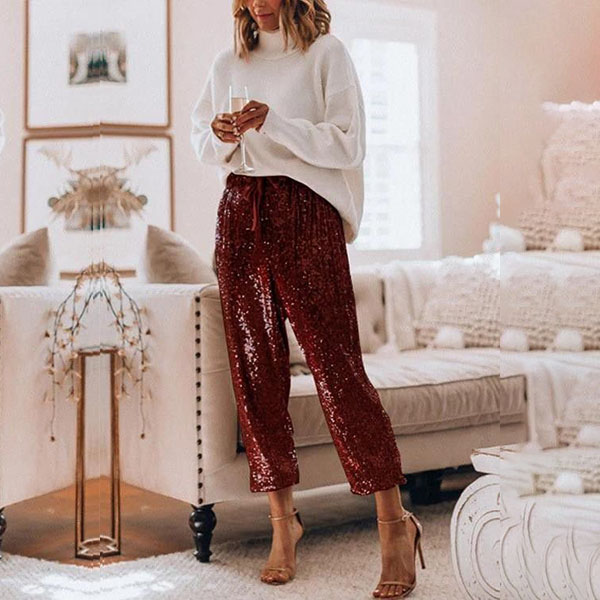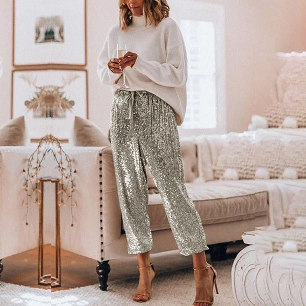 Det är en fantastisk möjlighet att uppdatera din garderob med dessa byxor. Paljettdesignen ger dem en glänsande och attraktiv look, samtidigt som den höga midjan, den lösa siluetten och det luftiga materialet håller dig bekväm samtidigt som den framhäver din smala figur. För att skapa en sexig och charmig look kan du matcha dem med en crop top!