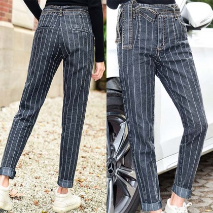 Fashion High Waist Relaxed-fit Striped Pants with Waist Strap