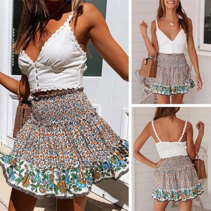 Bear the envious eyes wherever you go, thanks to the stylish taste of this skirt. Its vibrant floral print details make this piece look so eye-catching,while the ruffle hem design will further enhance its charm. No matter matching with a t-shirt,shirt,crop top and cami top,you can look beautiful enough!