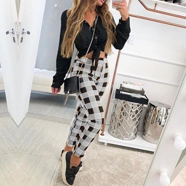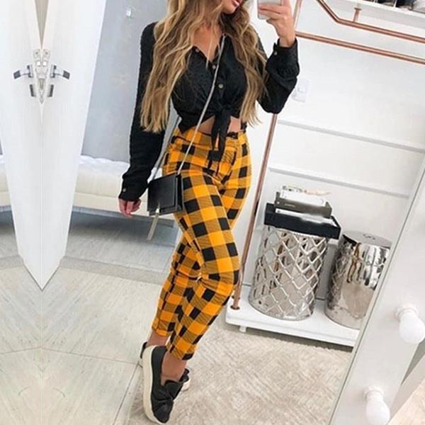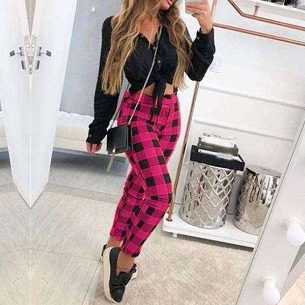If you like plaid element,then this pants can easily arouse your interest. This plaid pants is designed with high waist and a fit silhouette,this pants can showcase your slender legs. You can match with a crop top to achieve for a sexy and charming style.