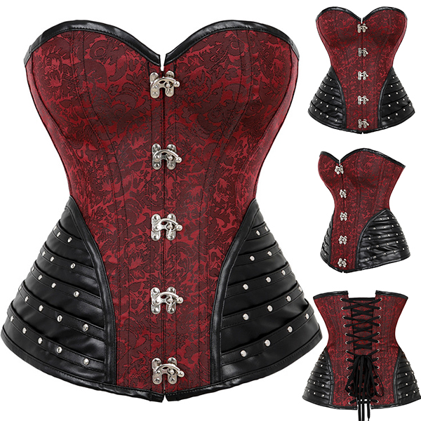Mode Jacquard korsett med främre spänne, baksida snörning och axelbandslös design i konstläder PU
