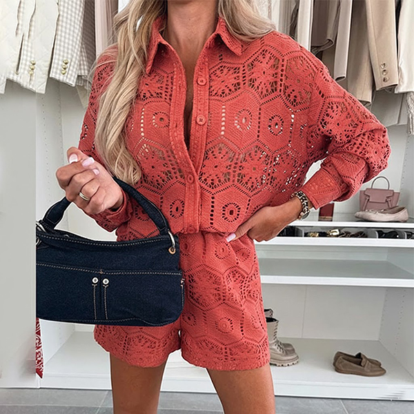 Detta spetsset har ett intrikat jacquardmönster och en delikat spetskonstruktion som ger modern, koordinerad elegans. Spetsblusen tillför en romantisk textur och feminin dragningskraft, medan de matchande spetsshortsen skapar lekfulla proportioner och en enhetlig, sofistikerad stil. Finns i flera färger.