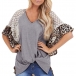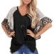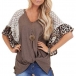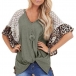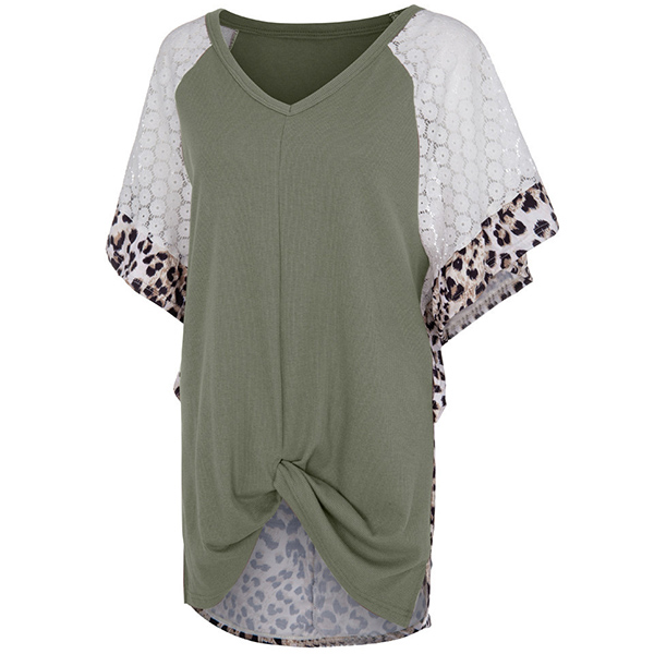 Fashion Lace Leopard Spliced Lotus Sleeve V-neck Twisted Hem T-shirt