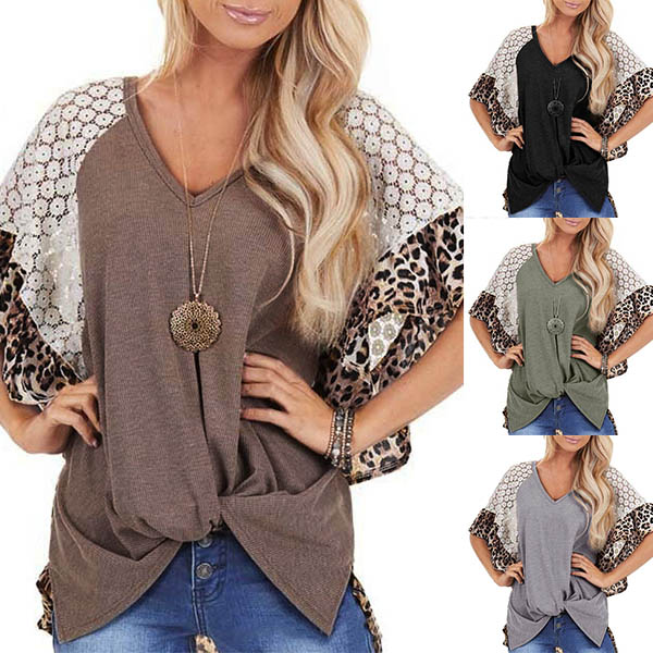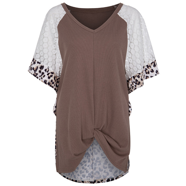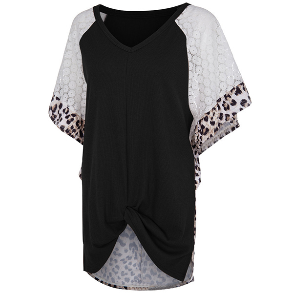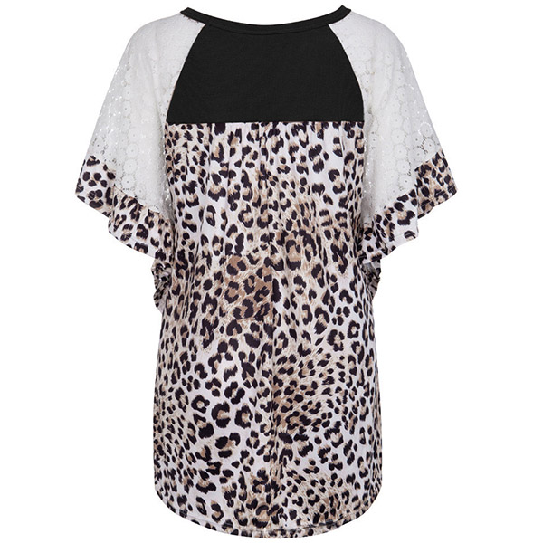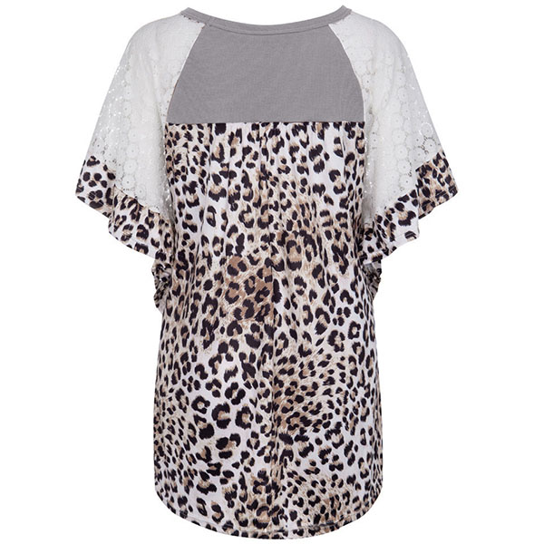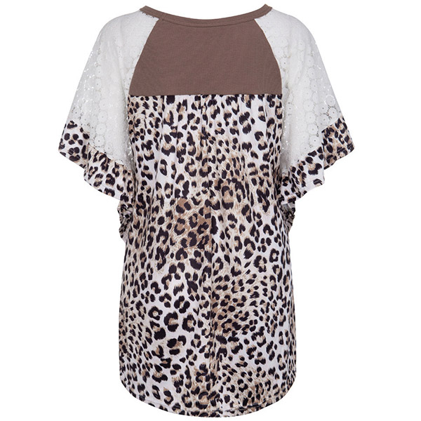 Inject a dash of fresh blood to your simple and dull wardrobe with this t-shirt! Its distinctive design details like lotus sleeve,lace and leopard element and twisted hem make this piece look so attractive. When you update your daily style,this t-shirt is a good choice.