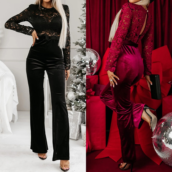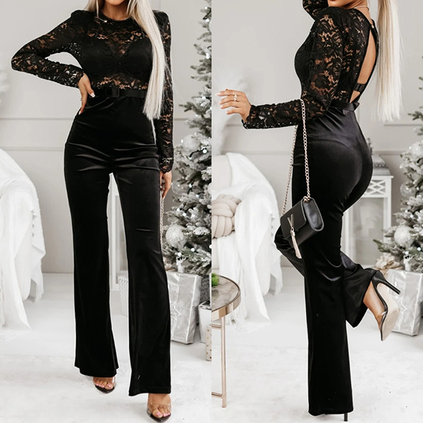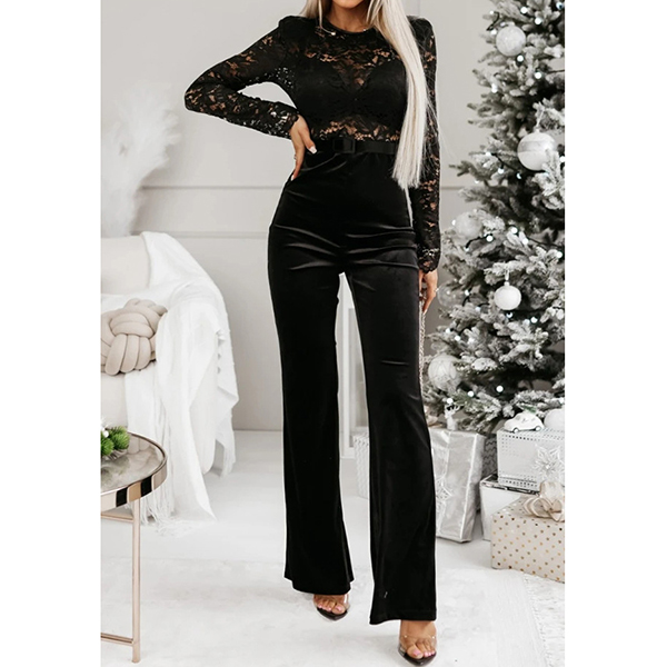 Trendig damspetsjumpsuit med rund halsringning, långa ärmar och raka ben
