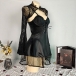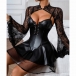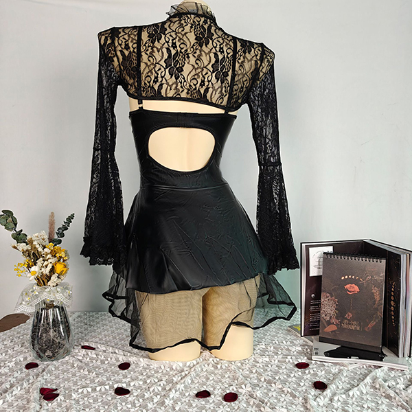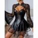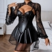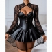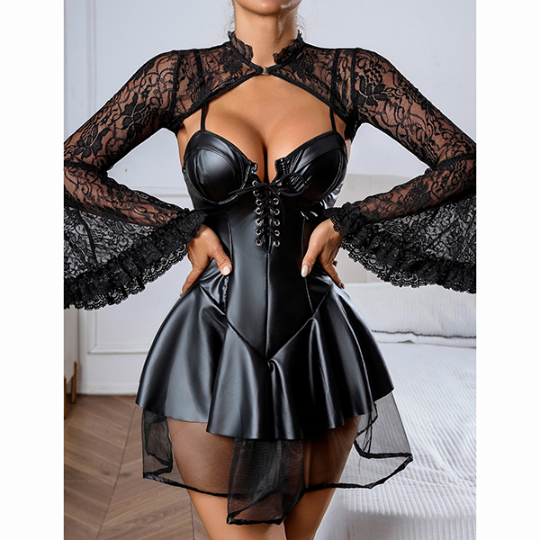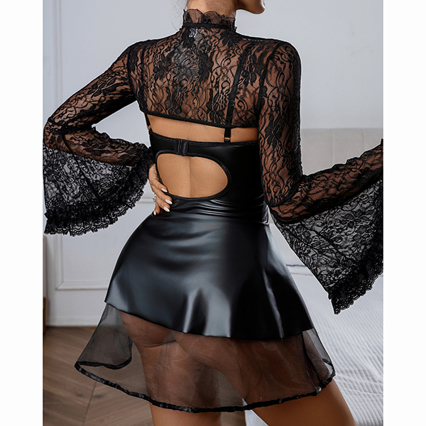 Damklänning i PU-konstläder, trendig spetsdetalj, snörning, långärmad rygglös modell med volangfåll