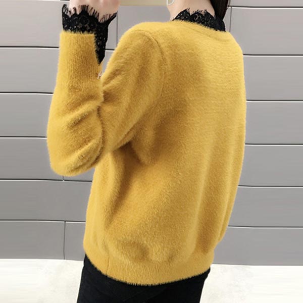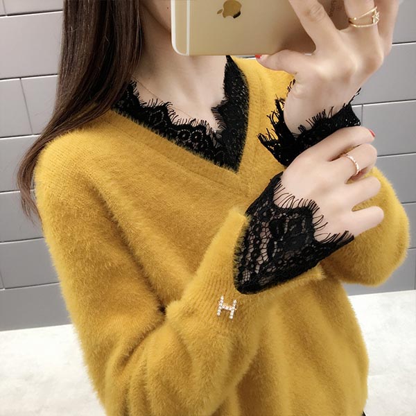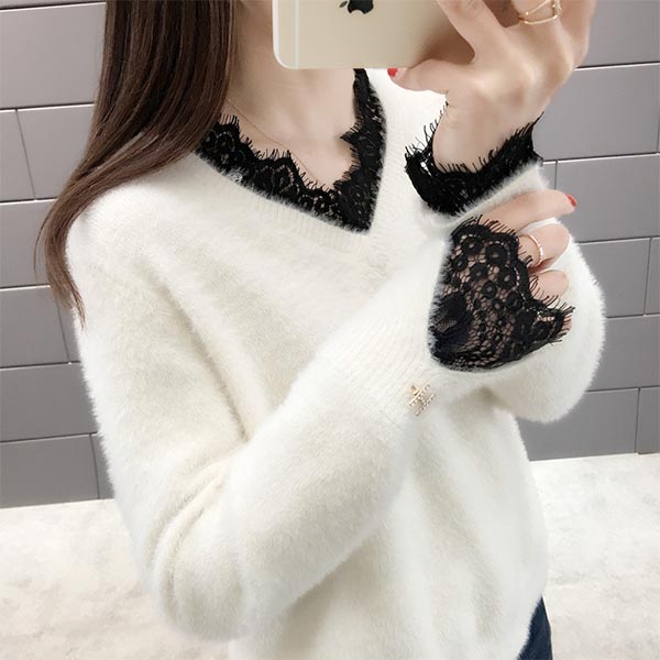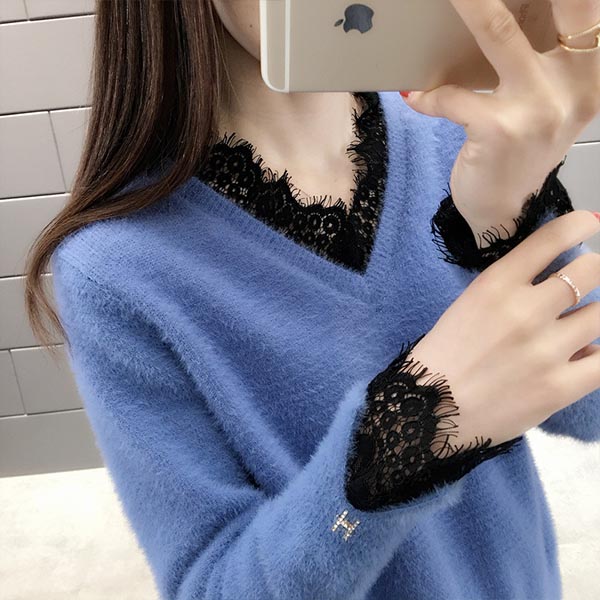 Take an interest with this knit top to give your wardrobe a seasonal update. Crafted from soft and cozy fabric,with long sleeve and v-neck design,this piece knows how to give you warm and comfortable day,while the lace spliced details at the cuff and neckline part will help boost its charm. All-match design allows to be matched with different style bottoms.