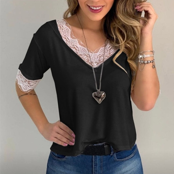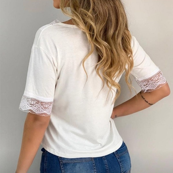 Your casual weekends call for such a relaxed and stylish t-shirt. Crafted from soft and breathable fabric,with short sleeve and v-neck design,this t-shirt can give you a long-lasting comfort. Moreover,the lace spliced details will add some extra charm. You can match it with your favourite pants to start your day!