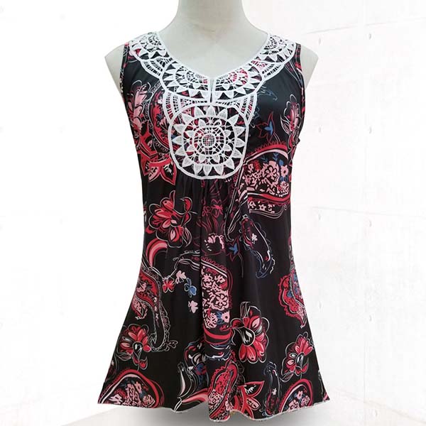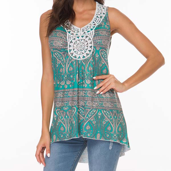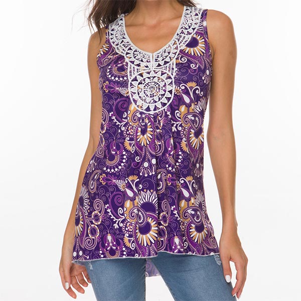 For these hot summer days,you need such a chic and stylish tank top. Its colorful printed details make this piece look so eye-catching,while the lace spliced v-neck design will further enhance its charm. Try to match with a shorts to have a cool and comfortable day.
