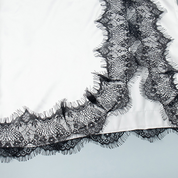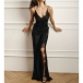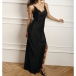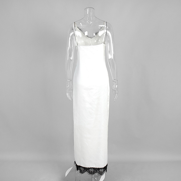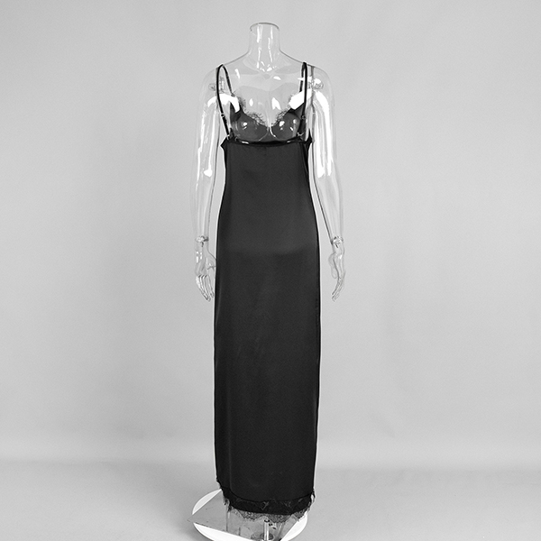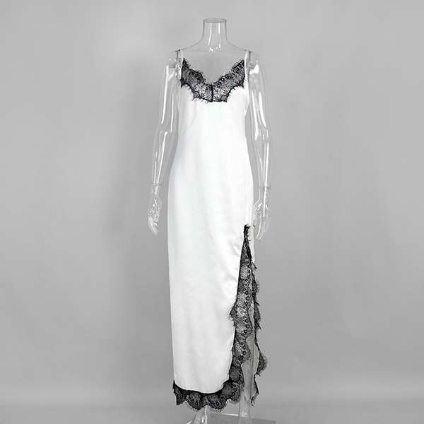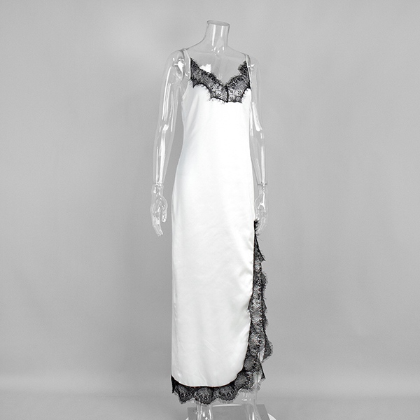 Njut av sensuell elegans med denna hisnande underklänning som förkroppsligar romantisk lockelse från alla vinklar. Delikata spetsinslag ger lyxig textur och vintageinspirerad sofistikering, vilket skapar en vacker kontrast mot ett slätt, böljande tyg. V-ringningen och den vågade sidoslitsen introducerar benöppning och rörelsefrihet, medan den rygglösa designen säkerställer att du gör ett oförglömligt intryck bakifrån. Vill du ha en?