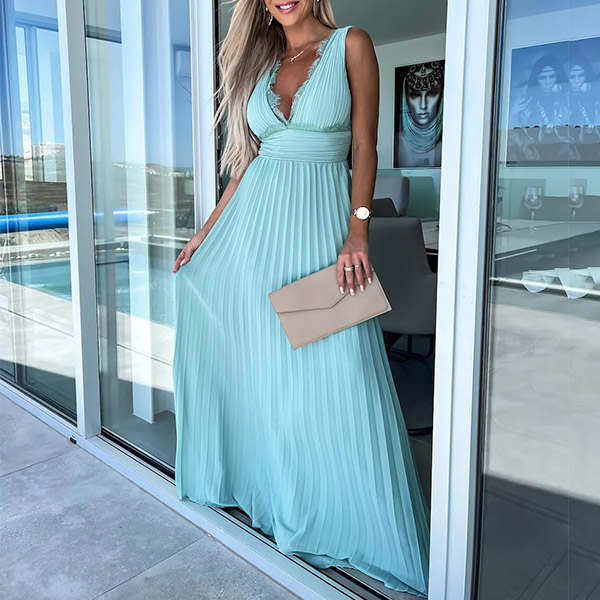 Fashion Lace Spliced V-neck Sleeveless Pleated Maxi Dress