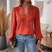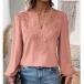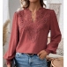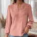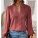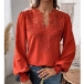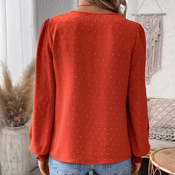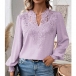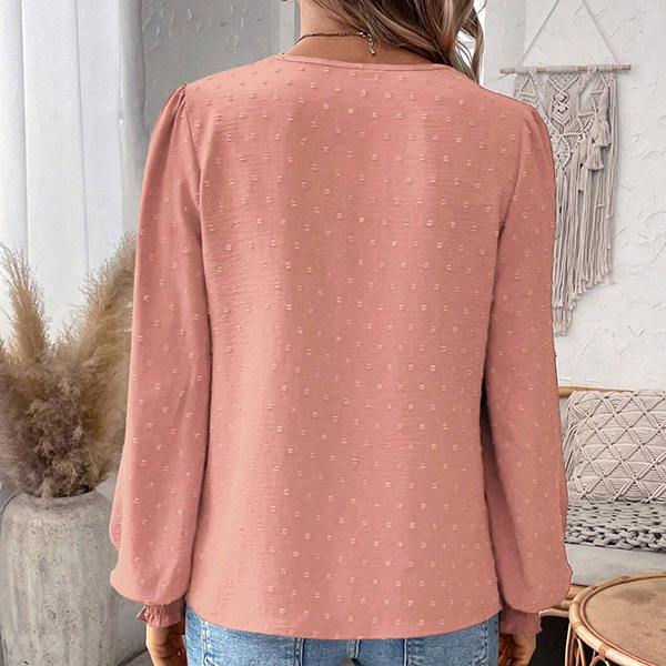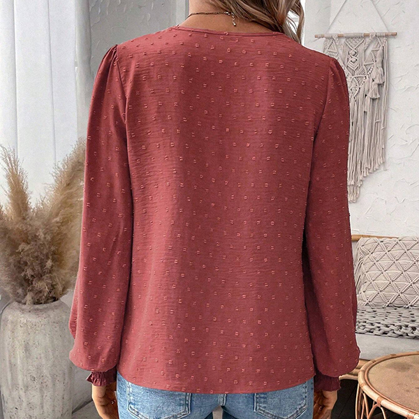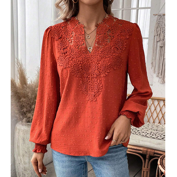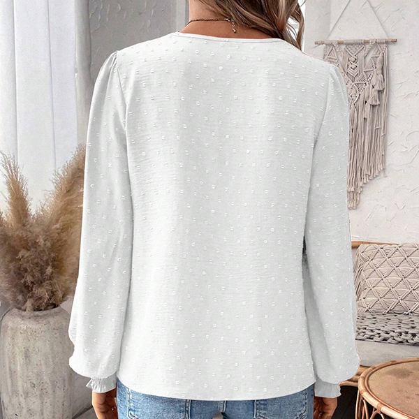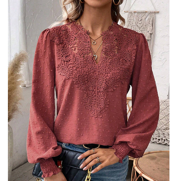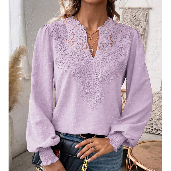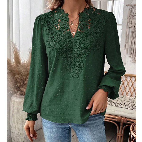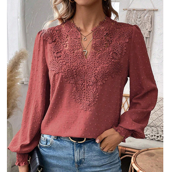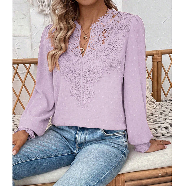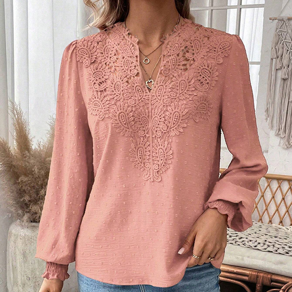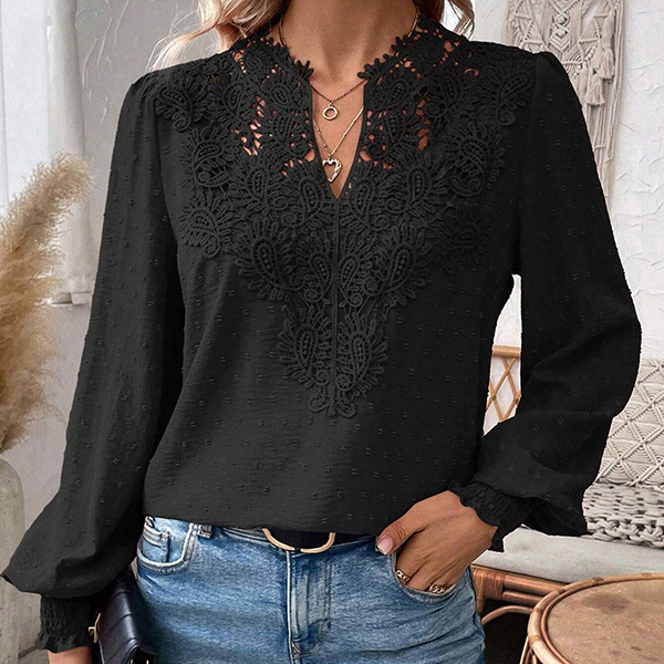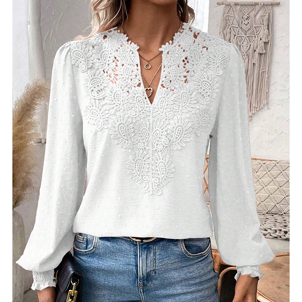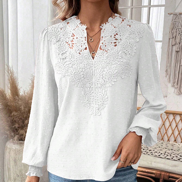 Spetsblus i trendig design med V-ringning och schweizprickar