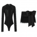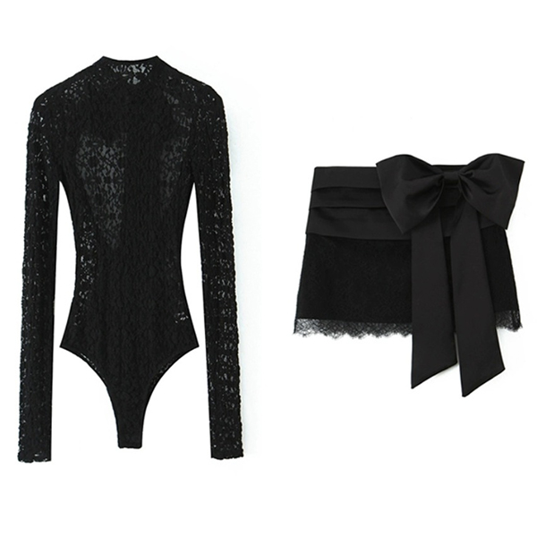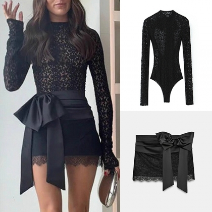Upplev exklusiv romantik med detta tvådelade set i halvtransparent spets, designat för att framhäva din silhuett med en sensuell rygglös bodysuit och en nätt minikjol prydd med en elegant rosett. Setets mjuka, stretchiga material och omsorgsfullt utformade detaljer erbjuder både bekväm passform och trendig, feminin sofistikering. Den unika kombinationen av delikat spets och lekfull rosett skiljer setet från andra plagg på marknaden, medan den öppna ryggen tillför en förförisk touch. Perfekt för dejtkvällar, romantiska tillfällen eller som en chic date-night look – detta set ger dig omedelbar wow-faktor och höjer din garderob med en exklusiv, modern twist.