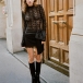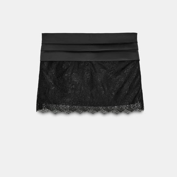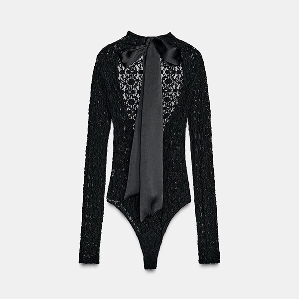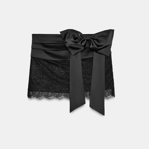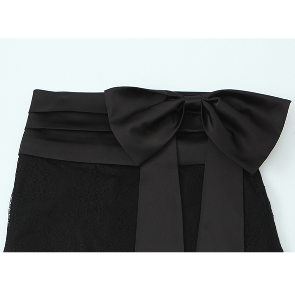 Trendigt tvådelat spetsset med rygglös, halvtransparent body och rosettprydd kjol