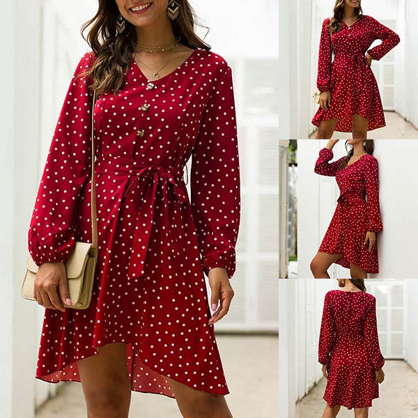 Looking for a beautiful dress for your daytime out or night dating? Then look no further than this dress. The dots printed details make it look so eye-catching and playful,while the v-neck,lantern sleeve and high-low hem design will further enhance its charm. This dress makes it easy for any girl to look effortlessly charming and beautiful!