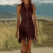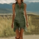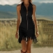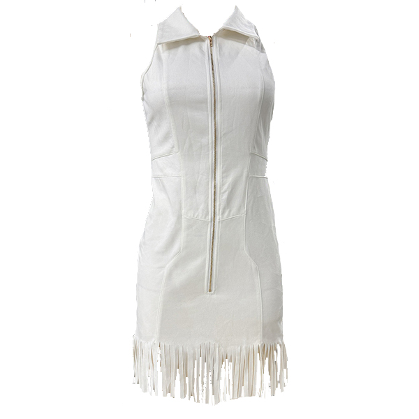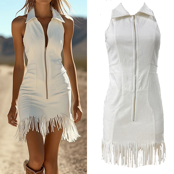 Den här klänningen har en modern och moderiktig stil med en strukturerad slagkrage och en elegant dragkedja framtill som ger ett samtida, skräddarsytt uttryck. Den fransade fållen tillför dynamisk rörelse och lekfull förfining. Den åtsittande konstruktionen ger en smickrande silhuett med självsäkra proportioner och framhäver den vackra balansen mellan den strukturerade kragen och den fransade fållen. Vill du prova?