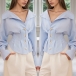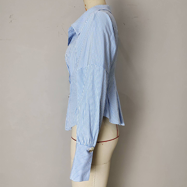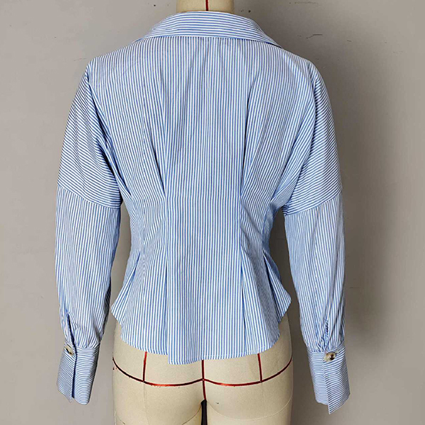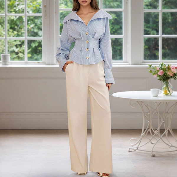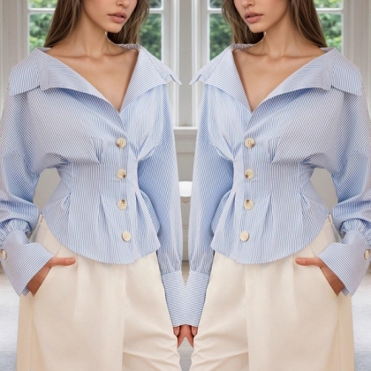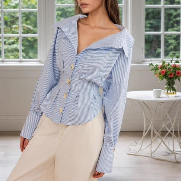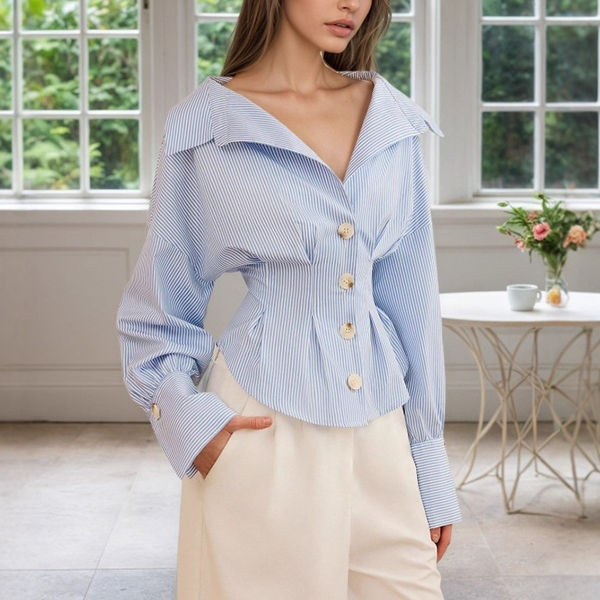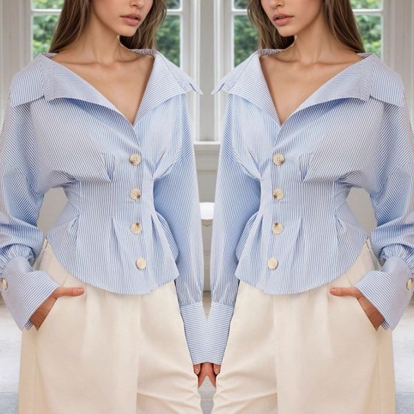 Den här skräddarsydda skjortblusen kombinerar strukturerade slag med en djup V-ringning som förlänger halsen och skapar en sofistikerad, feminin silhuett. Den patenterade åtsittande midjedetaljen formar midjan och förvandlar den klassiska button-down-silhuetten till ett figursmickrande mästerverk. Mjuka, hållbara material med hög andningsförmåga säkerställer komfort under hela arbetsdagen. Exklusiva detaljer som noggrant placerade sömmar och premiumknappar ger en lyxig känsla. Perfekt för en klassisk kontorslook – bär den instoppad i skräddade byxor eller pennkjol för affärsbeklädnad i toppklass. För en modern twist, kombinera med vida byxor och minimalistiska accessoarer för en avslappnad men professionell outfit. Denna mångsidiga blus lyfter varje garderob med tidlös elegans och framhäver din feminina charm.