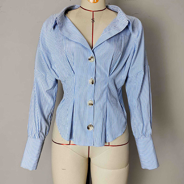 Stilren blus i slagkrage med V-ringning, knappslå fram och markerad midja