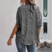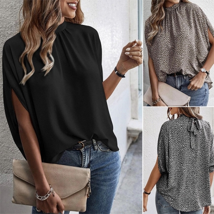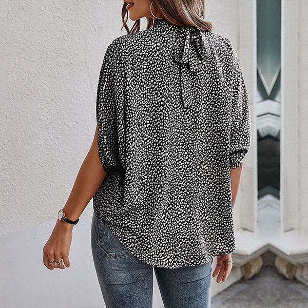 Fashion Leopard Printed Self-tie Mock Neck Batwing Sleeve Shirt