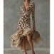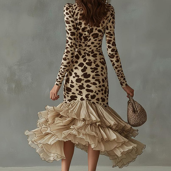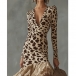 Trendig leopardmönstrad volangklänning med V-ringning, långärmad design och hög-låg fåll