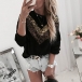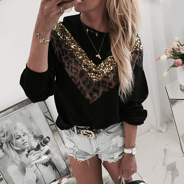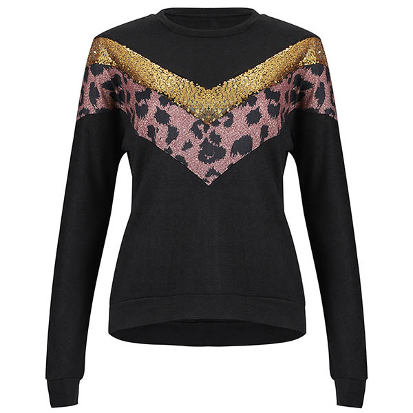 Fashion Leopard Sequin Spliced Long Sleeve Round Neck Sweatshirt