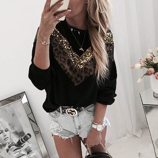 Exude a sense of casual and stylish charm by donning this sweatshirt. The most attractive part of this piece is the leopard and sequin spliced details. Finished with long sleeve,round neck and breathable fabric,this piece also can give you a warm and comfortable day. Perfect fit for matching with different style bottoms like shorts,skirts,jeans and so on.