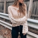 Fashion Leopard Spliced Lantern Sleeve Crossover V-neck Top