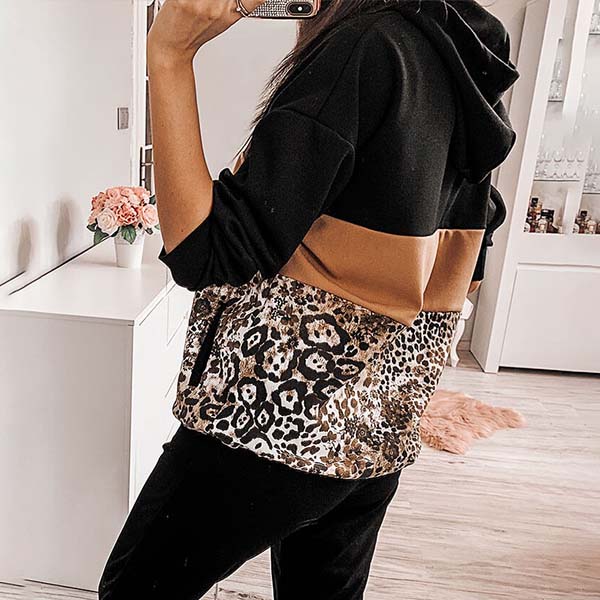 Fashion Leopard Spliced Long Sleeve Hooded Sweatshirt